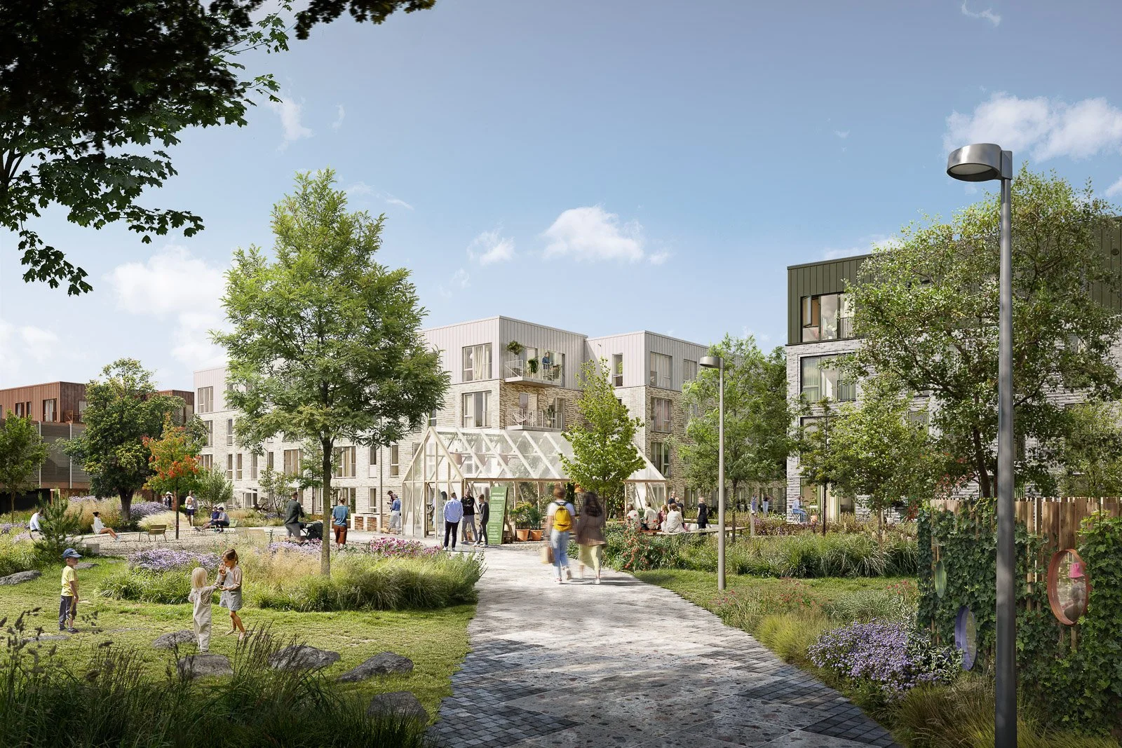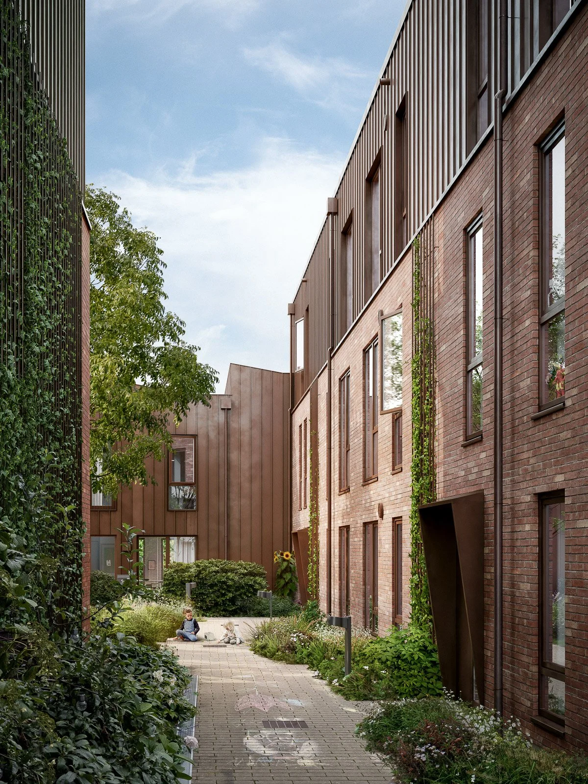 The images focus on human-scale perspective rather than dramatic aerials. Enough to communicate the project's basic character and site relationship without comprehensive coverage.